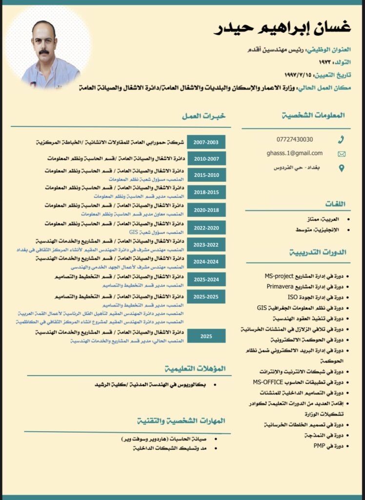 غسان ابراهيم حيدر مدير قسم المشاريع والخدمات الهندسية / دائرة الاشغال والصيانه Read more articles Previous Postبغداد/الرصافه Next Postهيثم خليل /مدير قسم تكنلوجيا المعلومات Post published:07/12/2025